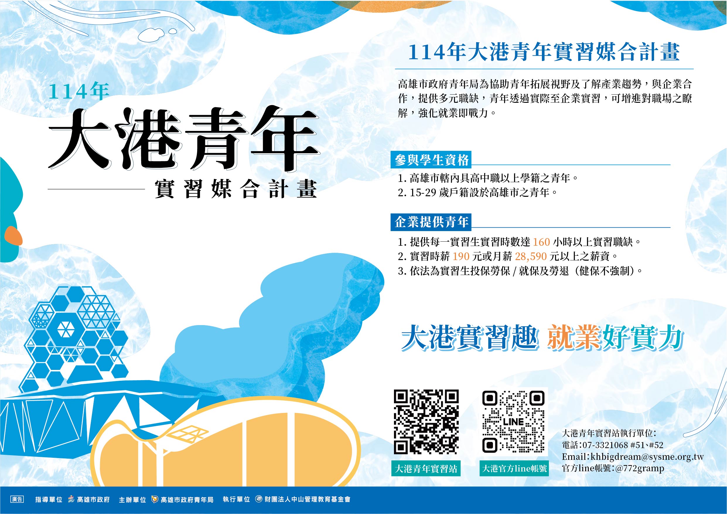 一、為提升本市青年職涯競爭力及能量,本局推動「大港青年實習媒合計畫」,作為連結平台角色,持續與高雄市學校、相關企業交流合作,整合高雄市實習資源,與企業共同推動人才培育,為高雄青年學子網羅各行各業的實習職缺,爰辦理旨揭計畫。