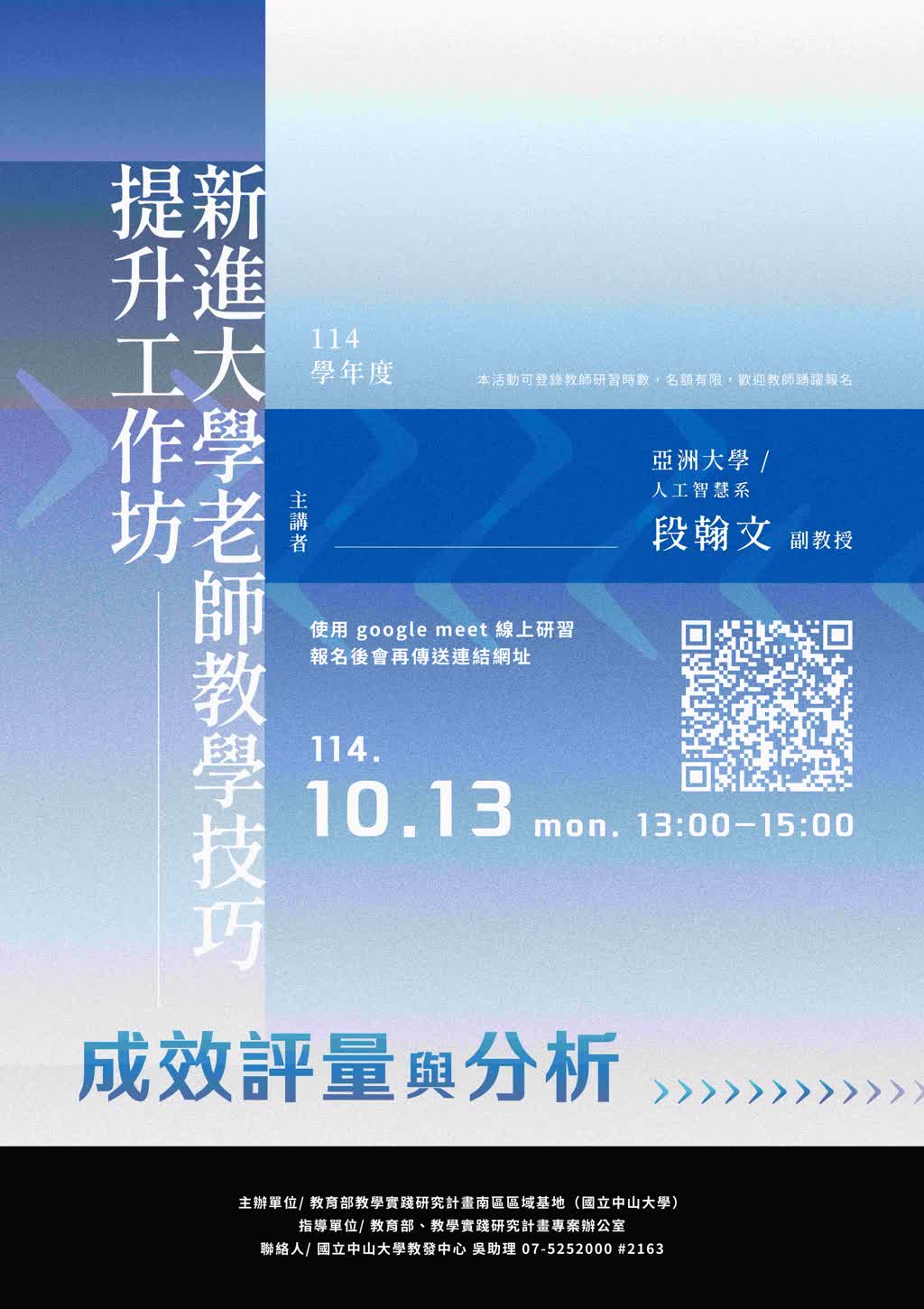 1、主題:新進大學老師教學技巧提升工作坊-成效評量與分析