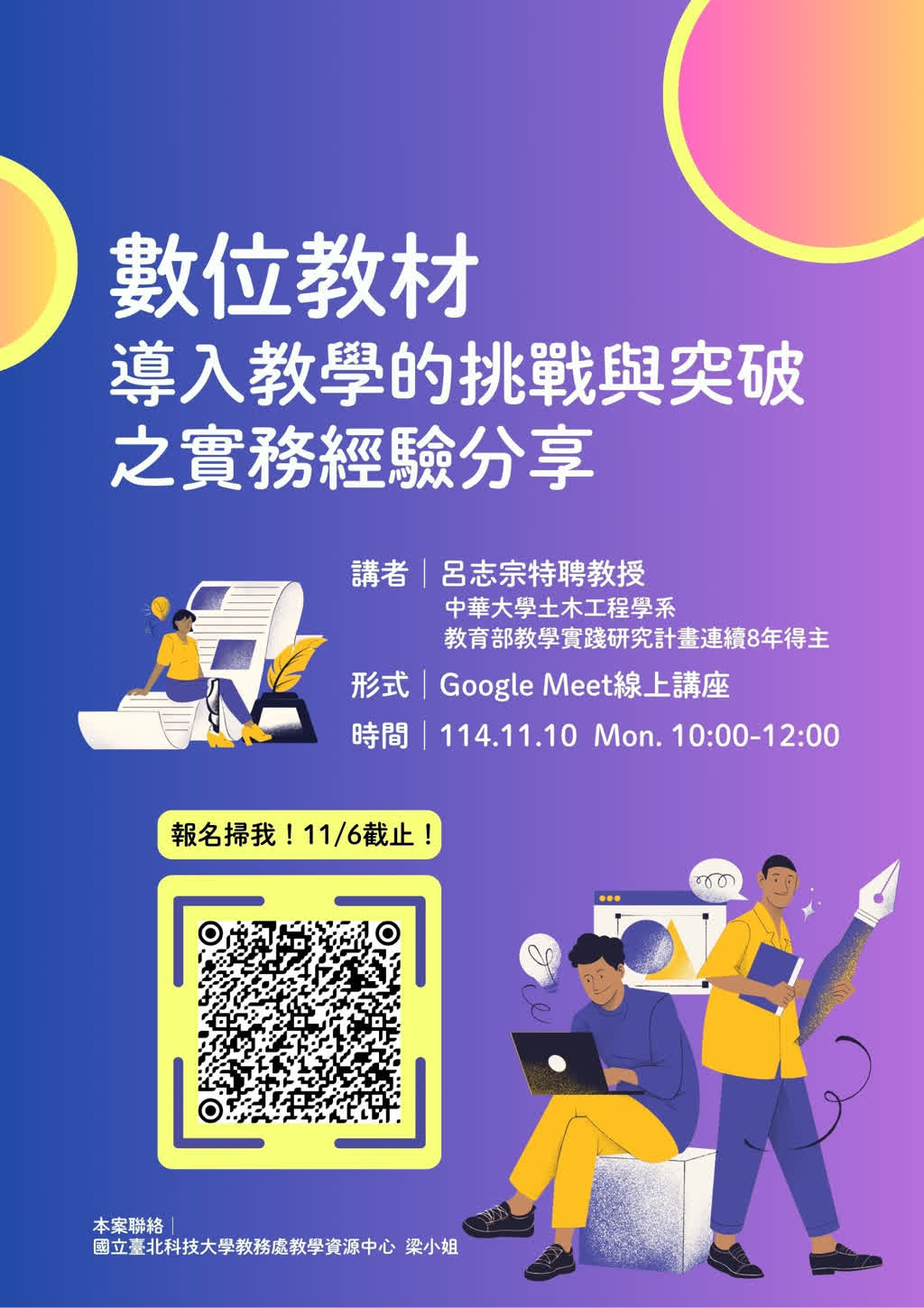 (八)報名網址︰https://forms.gle/pHA4oQpuKLyqiD3UA,報名至114年10月15日(三)17時止,如額滿將提早關閉表單。