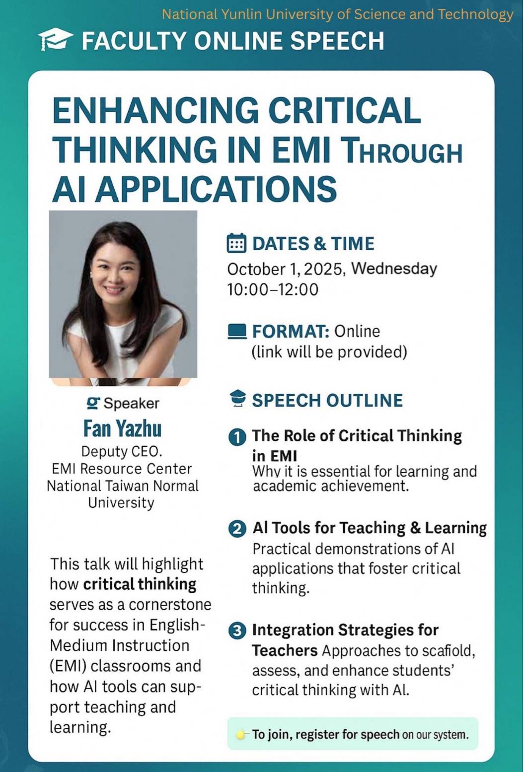 一、為協助教師深入了解如何結合 AI 創新與 EMI 教學法,進一步提升學生的學習成效,特辦理旨揭線上講座。