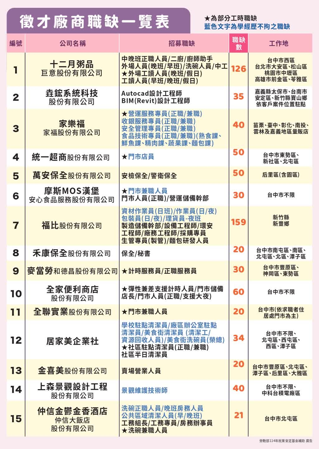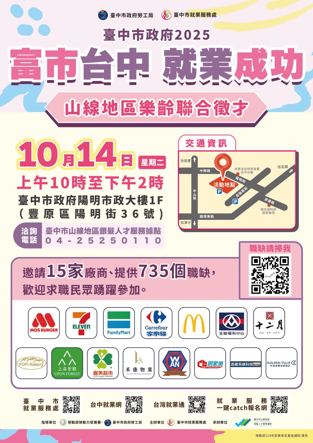 【校外徵才訊息】臺中市政府勞工局於114年10月14日(二)辦理「富市台中 就業成功」山線地區樂齡聯合徵才