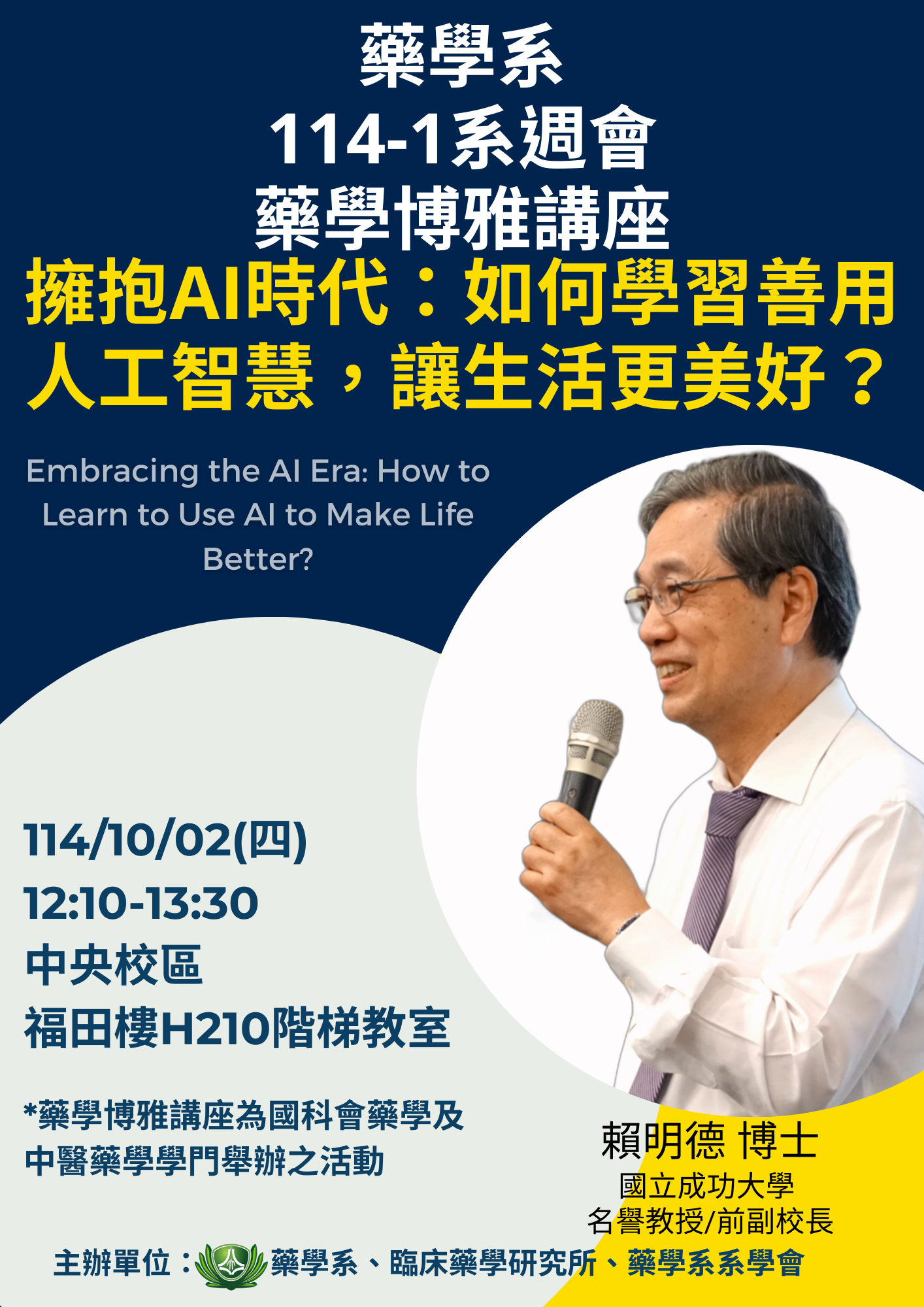 1141002【藥學博雅講座】國立成功大學賴明德名譽教授「擁抱AI時代:如何學習善用人工智慧,讓生活更美好」