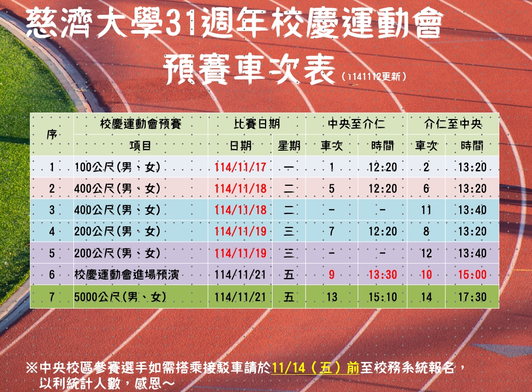 慈濟大學31週年校慶運動會預賽車次表