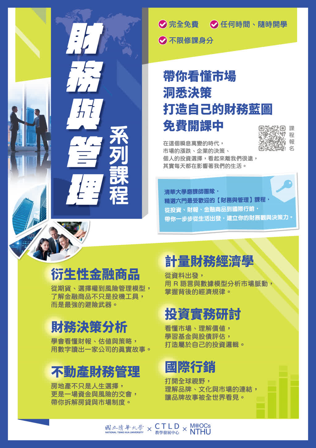 六、如有課程相關問題,請洽本校教學發展中心陳小姐,電話:(03)5715131分機35208,Email:iyu@mx.nthu.edu.tw。 1. The aforementioned courses are digital courses offered on our university's MOOC platform, focusing on the theme of "Finance and Management," including the following six courses: