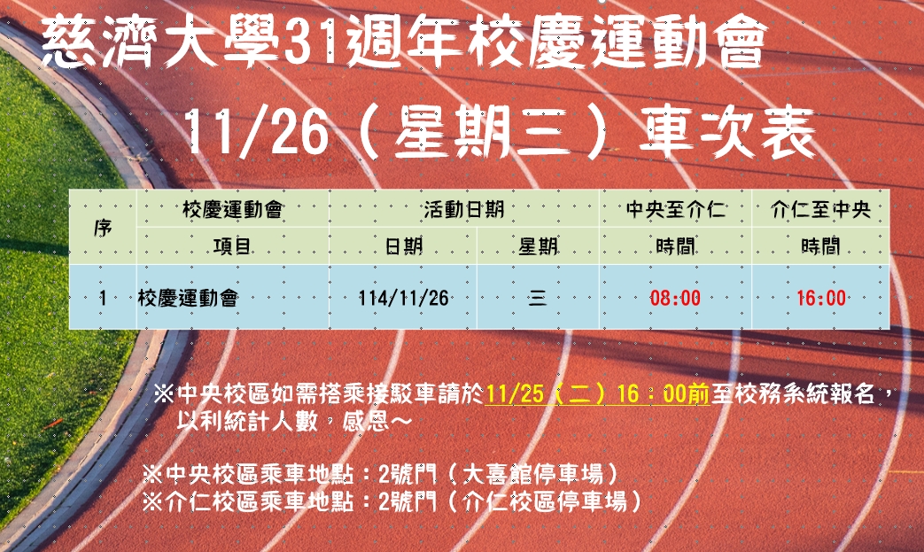 校慶運動會114/11/26(星期三)乘車時間地點如下: