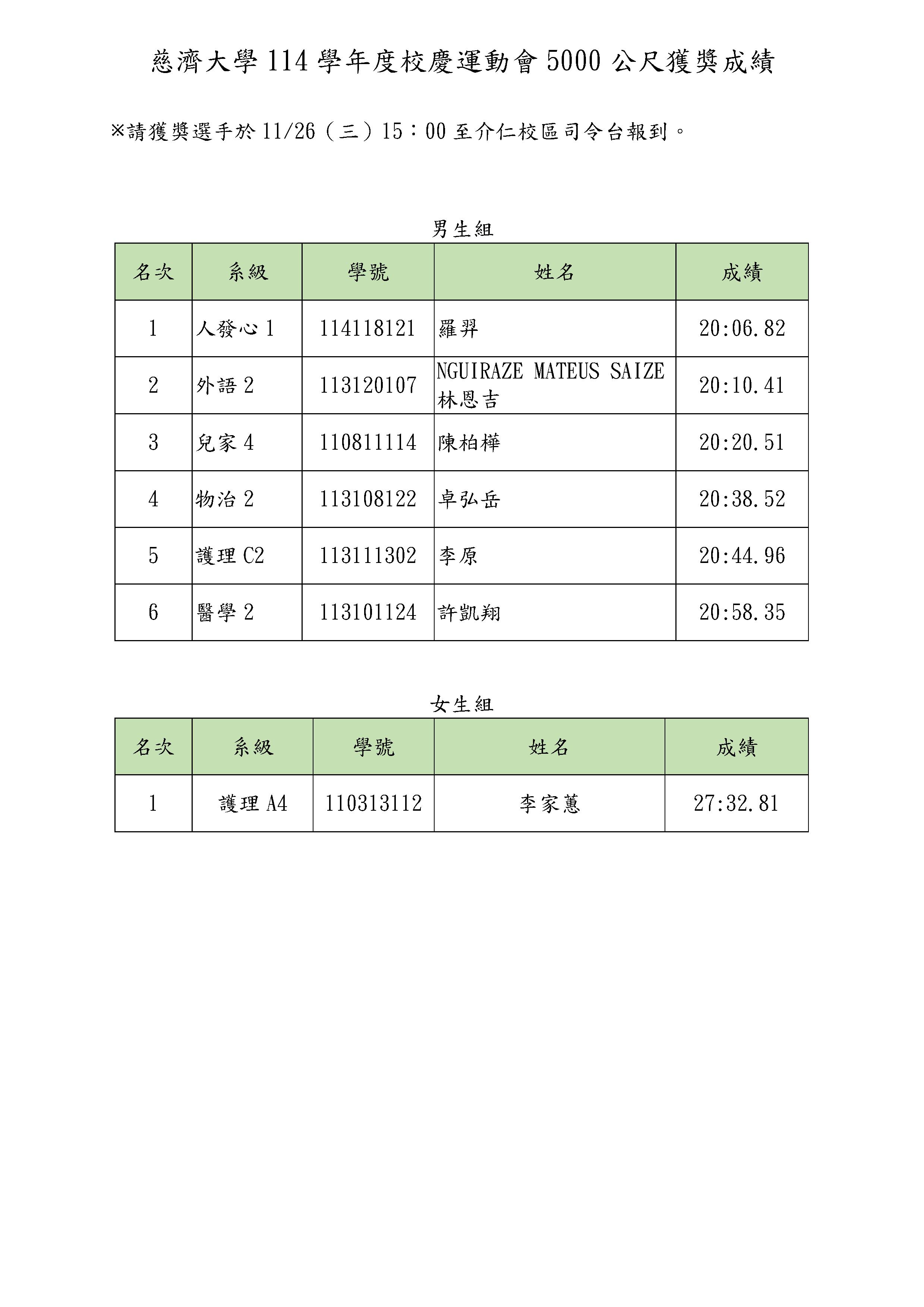 校慶運動會學生組5000公尺成績如附件