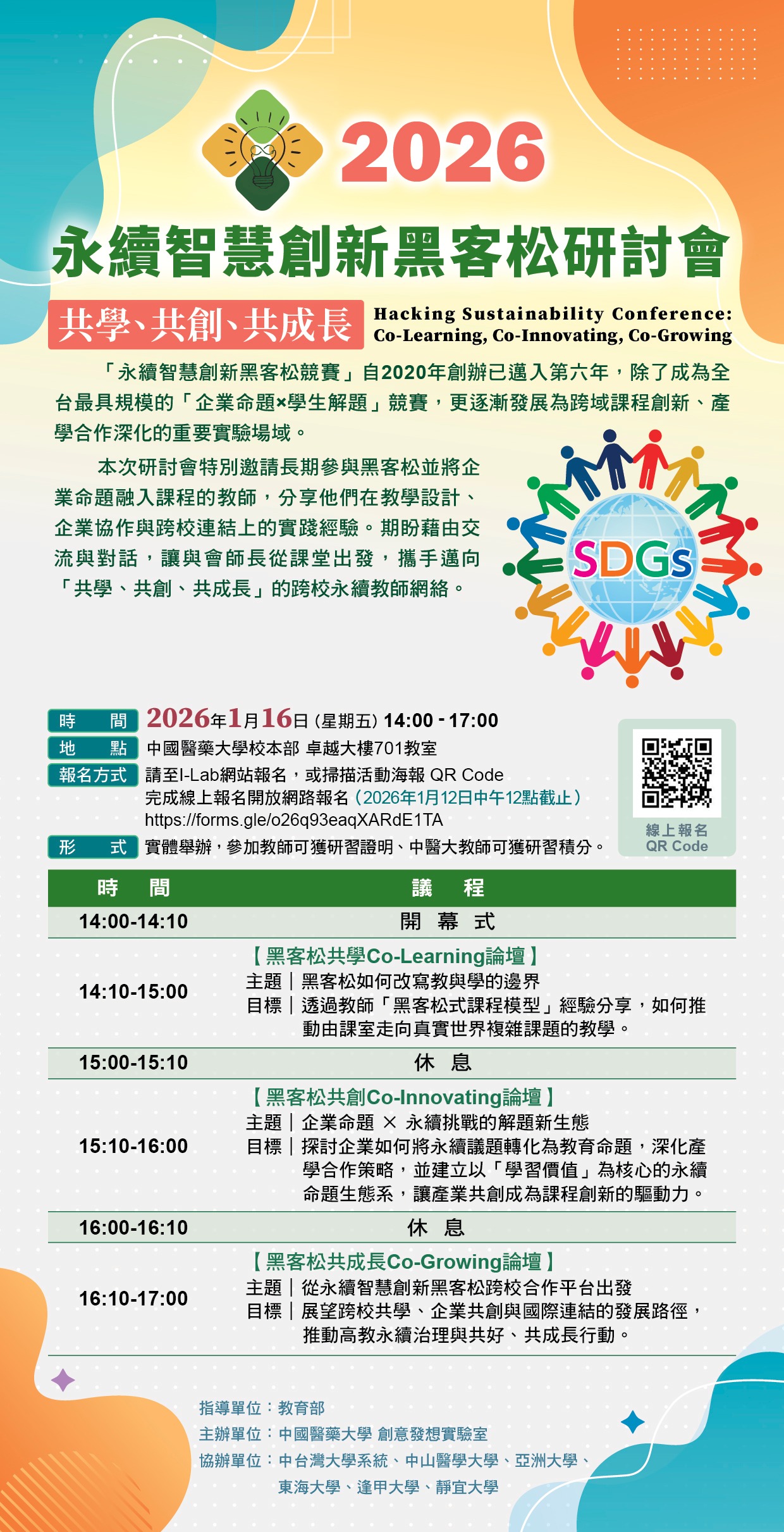 三、報名至115年1月12日中午12點截止,議程活動資訊網頁:https://ilab.cmu.edu.tw/news/269 I. The "Sustainable Smart Innovation Hackathon" has entered its sixth year since its inception in 2020. It has not only become the largest "Corporate Challenge × Student Solutions" competition in Taiwan but has also gradually evolved into a significant experimental platform for interdisciplinary curriculum innovation and deepening industry-academia collaboration. This year's "2026 Sustainable Smart Innovation Hackathon Symposium: Co-learning, Co-creation, Co-growth" will specially invite teachers who have been actively involved in the hackathon and have integrated corporate challenges into their courses to share their practical experiences in instructional design, industry collaboration, and inter-institutional networking. We encourage interested faculty members to register for this symposium, as it provides an opportunity for exchange and dialogue, enabling participants to embark on a journey toward a cross-institutional sustainable teacher network of "Co-learning, Co-creation, Co-growth" starting from the classroom.