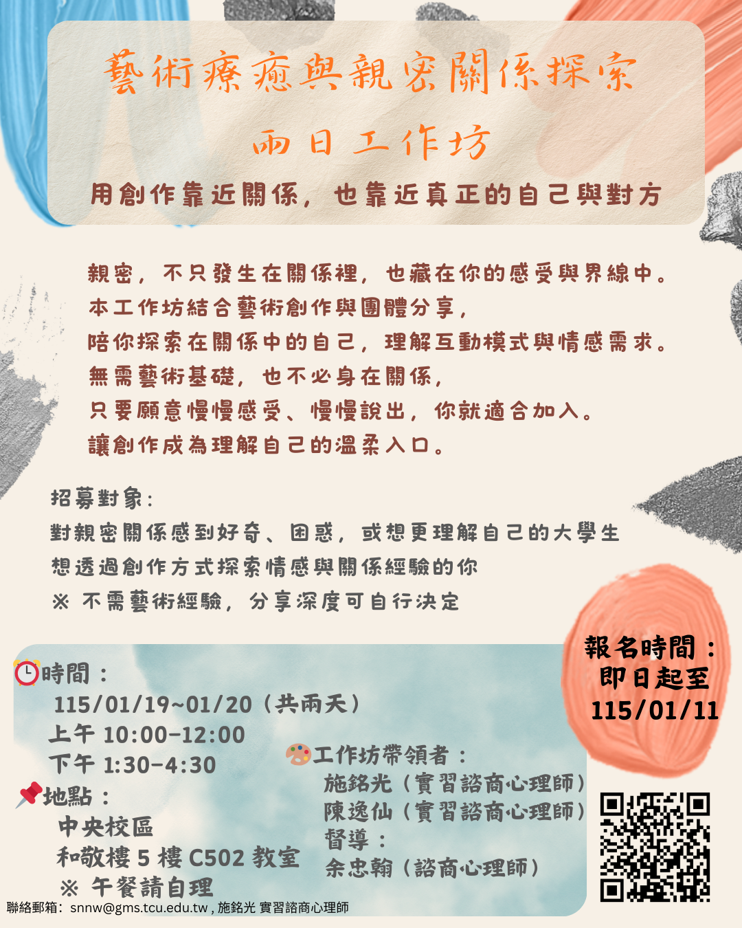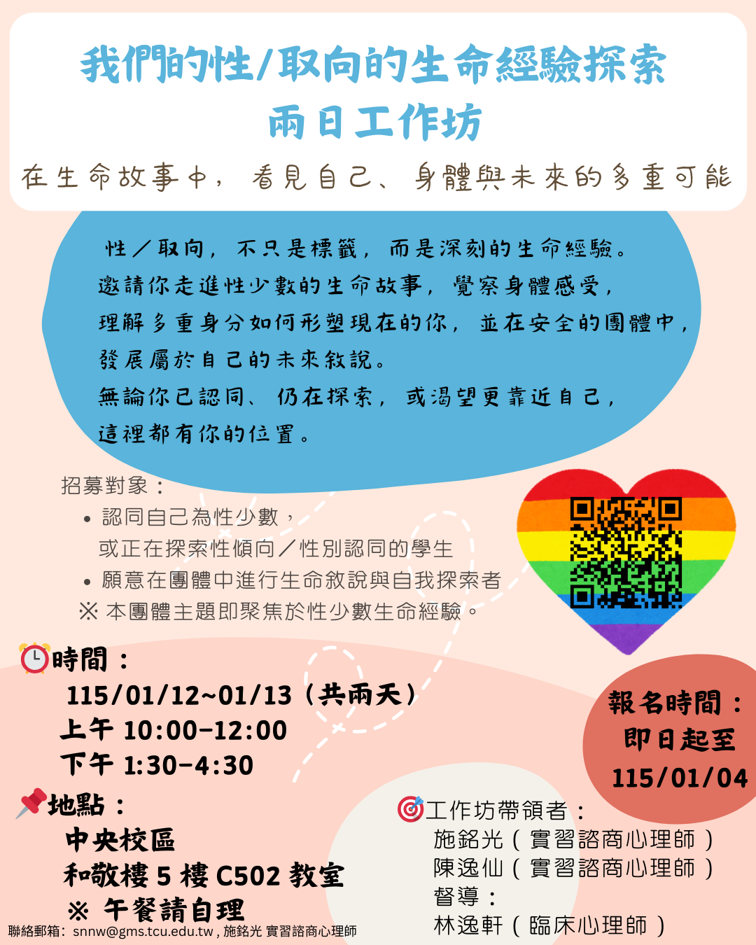 工作坊由 羅有至、陳逸仙、施銘光(實習諮商心理師)分別帶領,
