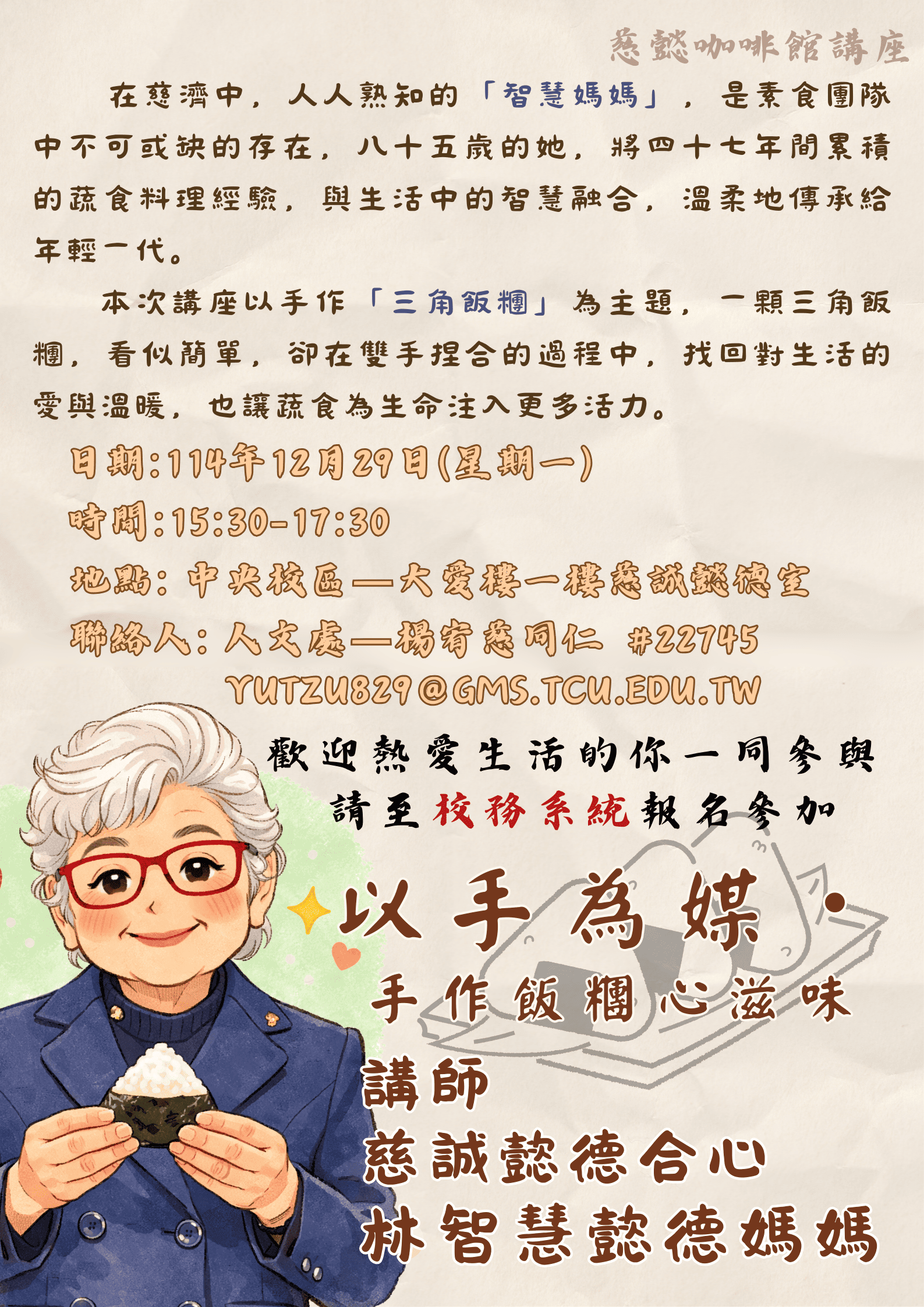 本活動無需任何料理基礎,適合所有對生活飲食、人文關懷有興趣的教職員生參與,誠摯邀請大家一同透過手作,感受蔬食的美好,捏出屬於自己的生活溫度。 We have a Yi-De Mom who spent more than half of her lifetime in Tzu Chi University, her name is Zhi-Hui, and the meaning of "Zhi Hui" in Chinese is "Wisdom". She is also a beloved figure within the vegetarian community, renowned for her warmth and dedication. At the age of 85, she has spent 47 years sharing her expertise in vegetarian cooking, passing down her wisdom and meticulous approach to younger generations with gentle care.