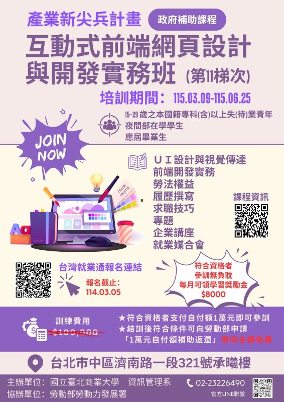 五、課程諮詢專線:(02)2322-6490,Line諮詢官方帳號:@914fhelz,加入連結:https://lin.ee/3KHxoqT **Announcement: Career Training Program for Youth (Including Recent Graduates) – Application Information**