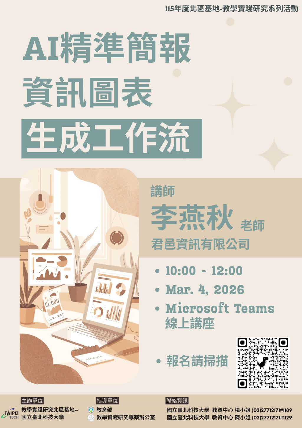 (二)國立臺北科技大學教學資源中心陳薇羽小姐,電話:(02)2771-2171#1129,Email:vivian1012@mail.ntut.edu.tw **Announcement: 2026 Regional Base Program for Teaching Practice Research Projects – Event Information**