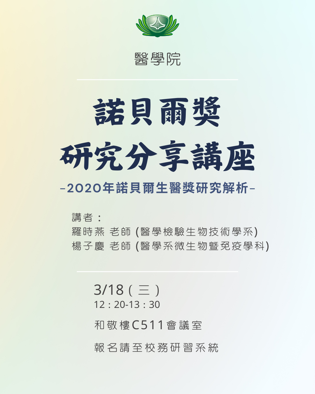 主  旨  【醫學院】諾貝爾獎研究分享講座-3/18(三)Nobel Prize Research Lecture – March 18 (Wednesday)