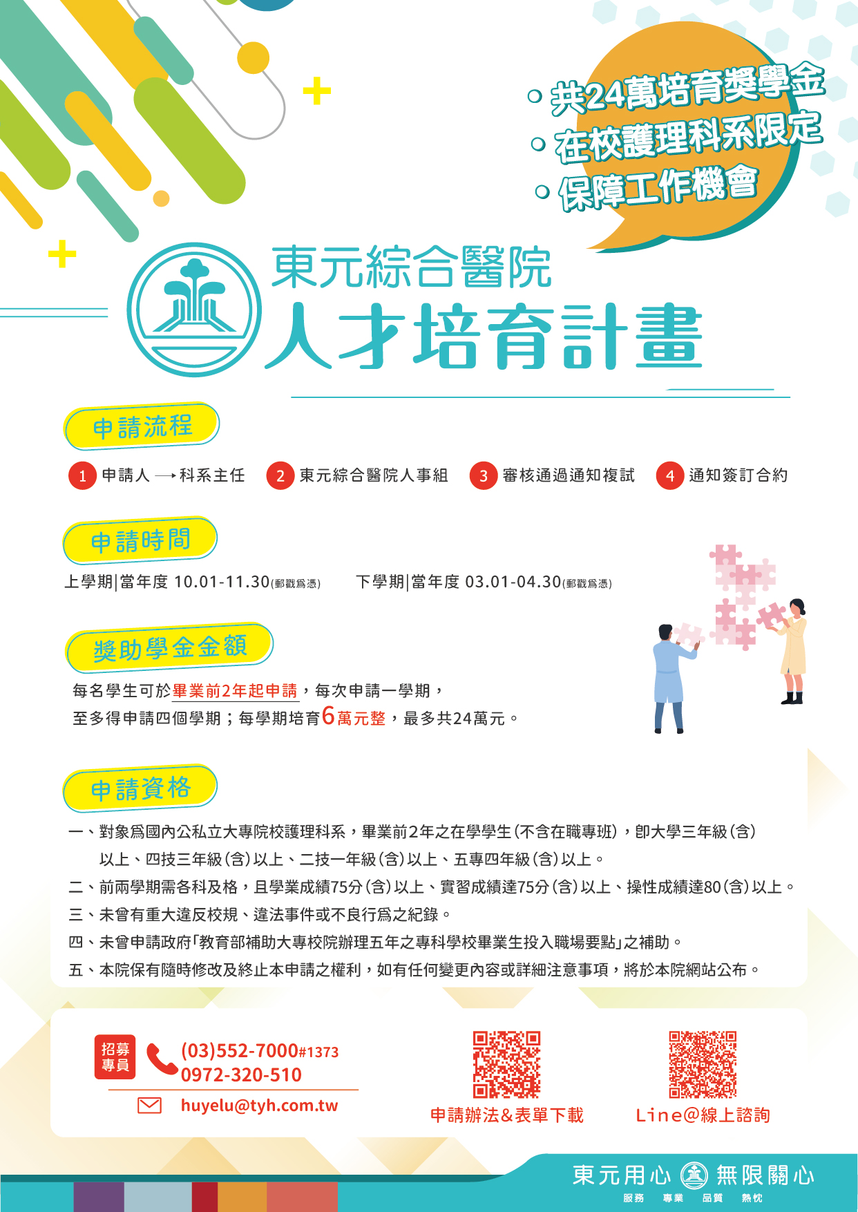 I. To cultivate and encourage outstanding domestic nursing talent to commit to clinical nursing careers, assist exceptional nursing students in completing their studies, and provide suitable employment opportunities, a talent development scholarship is offered to nursing program students. We kindly request your institution to publicize this program and encourage eligible students to apply.