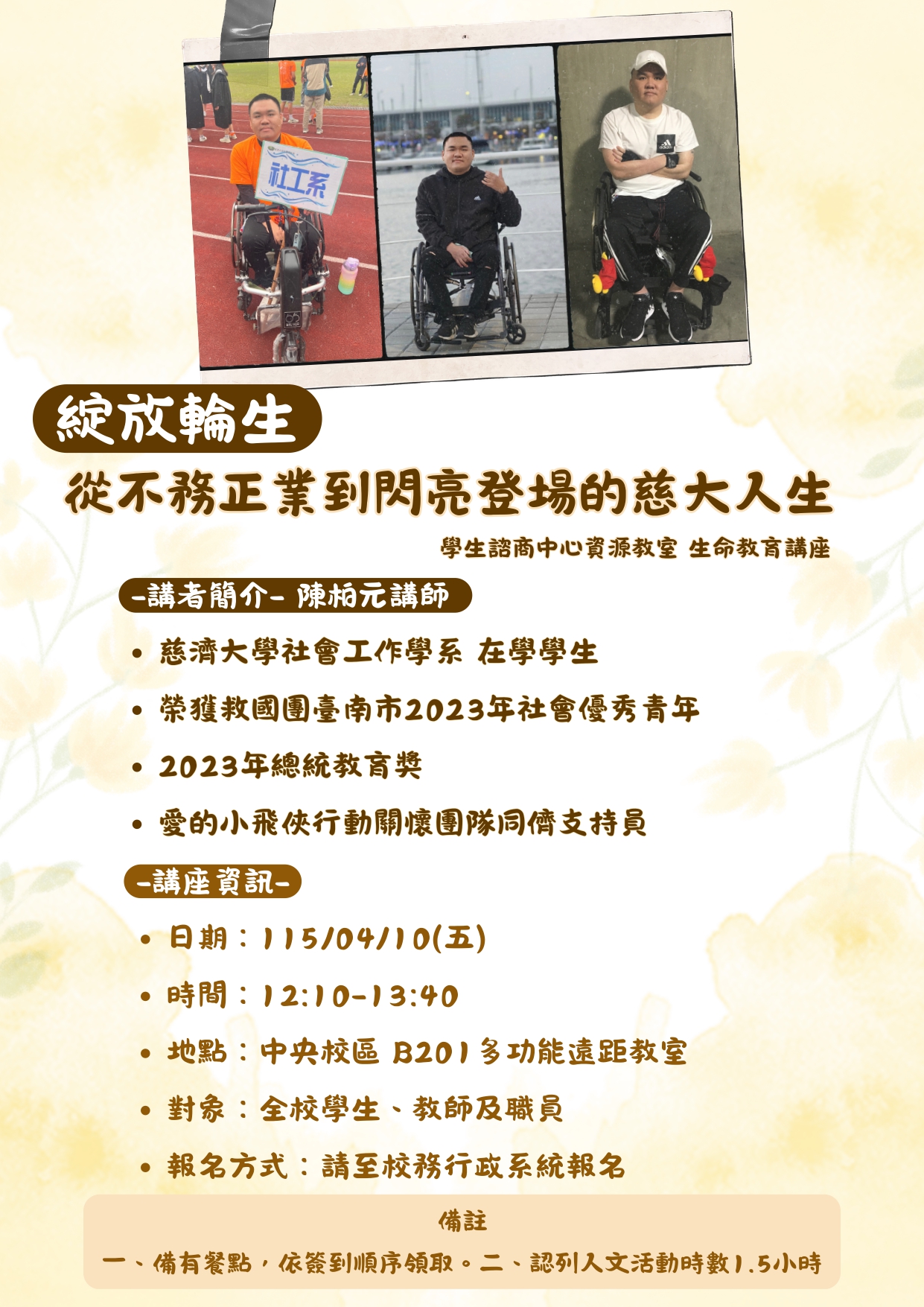 現在,他是慈濟大學社工系的輪椅學生,也是總統教育獎得主、救國團社會優秀青年、愛的小飛俠行動關懷團隊的一員。