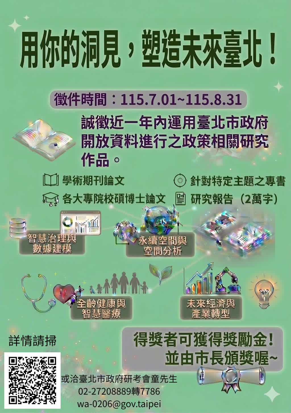 For details regarding the submission guidelines: To maintain the relevance of research, please note that submitted works must have been published within the past year (from July 1st of the previous year to June 30th of the current year). For any questions regarding the application, please contact Mr. Tung at (02)2720-8889 ext. 7786 or email wa-0206@gov.taipei. |
