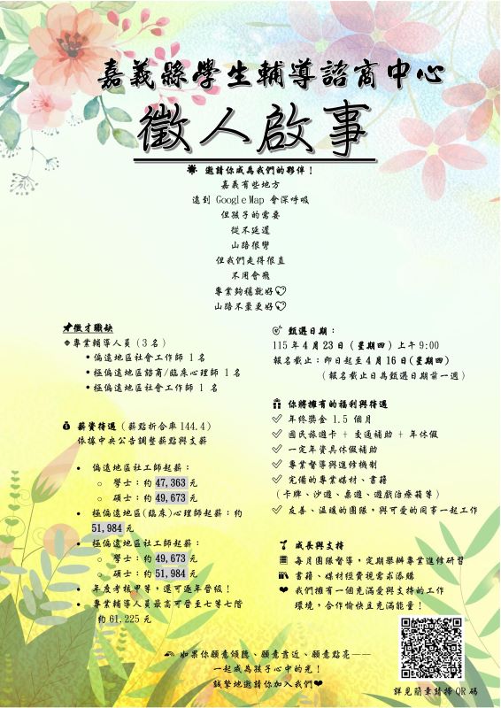 IV. Please send application materials via registered mail to: “Attn: Student Affairs and Special Education Section, Education Department, Chiayi County Government,” No. 1, East Section, Xianghe 1st Road, Taibao City, Chiayi County 612. Please mark the envelope with “Application Materials for Selection of Full-time Professional Counseling Staff.” For inquiries, please call 05-3620123 ext. 8306.