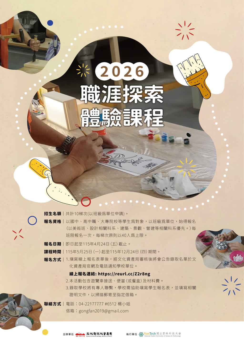 IV. For any matters not covered above or questions regarding the program, please contact Ms. Yang at the Cultural Heritage Crafts Workshop, Bureau of Cultural Heritage, Ministry of Culture, at (04) 2217-7777 ext. 6512 or via email at gongfan2019@gmail.com.