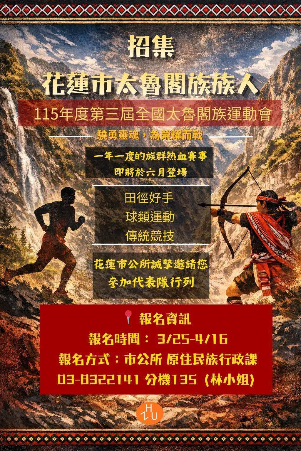 03-8322141 分機135(林小姐) **Announcement: Selection of the Hualien City Team for the 3rd National Taroko Ethnic Sports Games, 115 Academic Year**