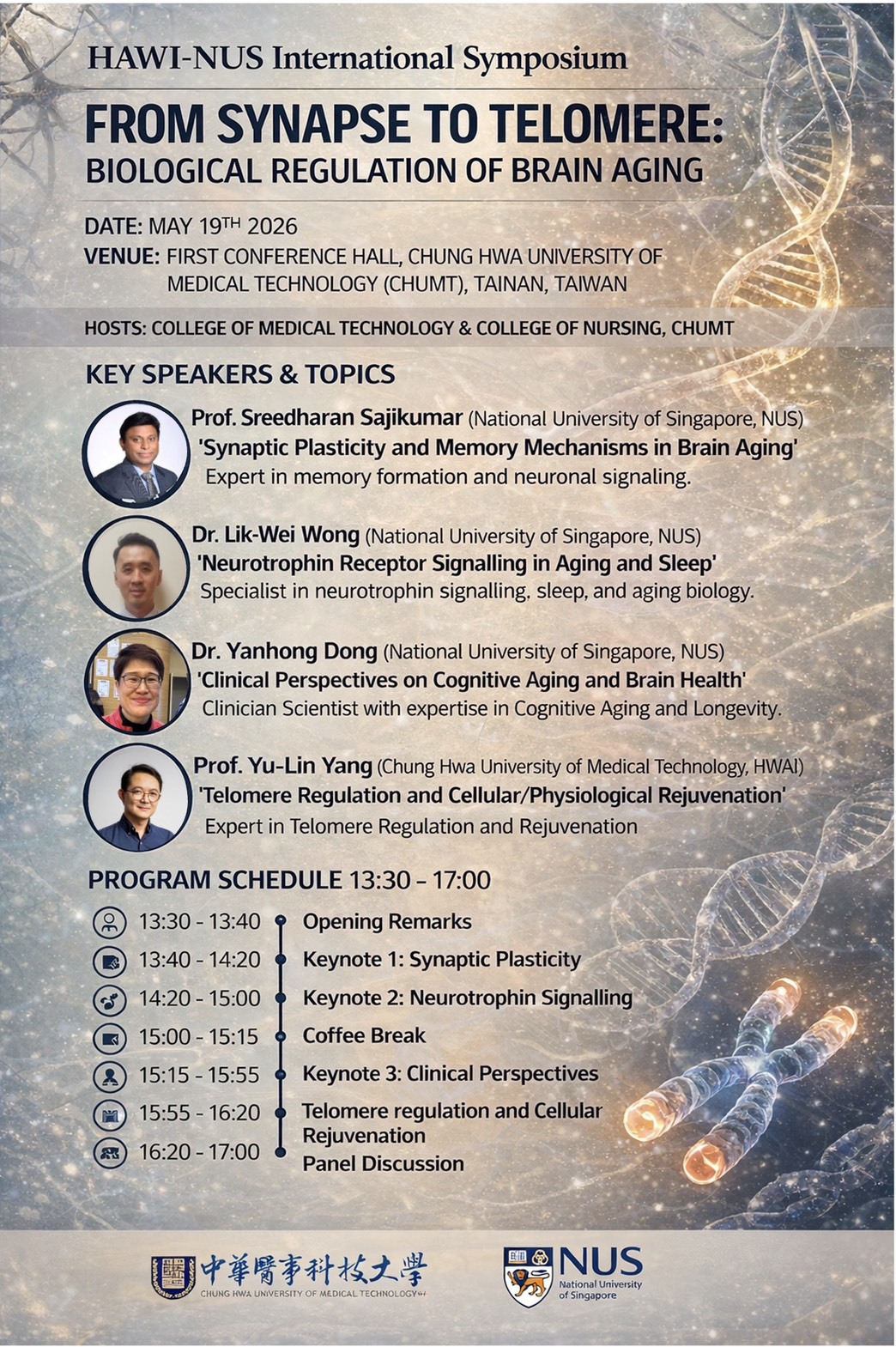 Note: Chung Hwa Medical University will be holding the "HAWI–NUS International Symposium: From Synapses to Telomeres – Biological Regulation of Brain Aging" on Tuesday, May 19, 2026, from 1:30 PM to 5:00 PM. |