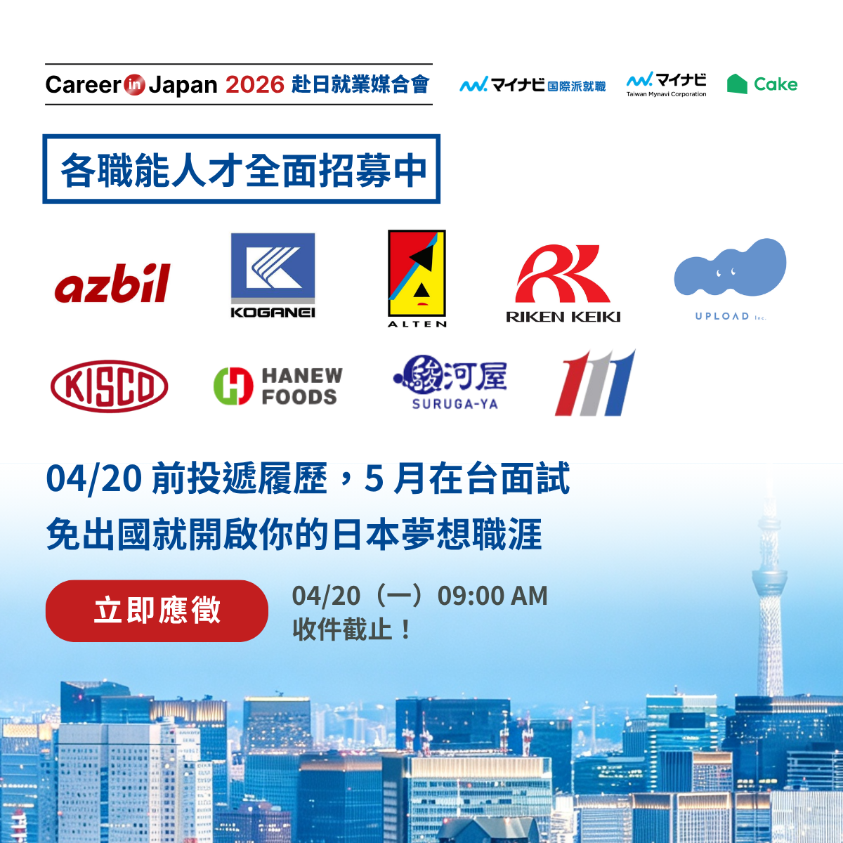 9 家日本指標企業直接飛來台灣,釋出工程師、產品設計、銷售業務、管理等全方位職缺——只要在 04/20(一)前投遞履歷,就有機會在台灣與日本企業面試!