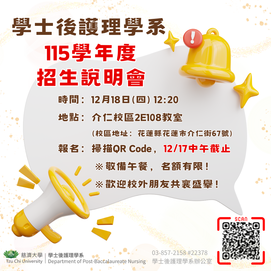 | 主 旨 【學士後護理學系】115學年度入學招生說明會 ※開放線上同步,歡迎校外朋友加入! |