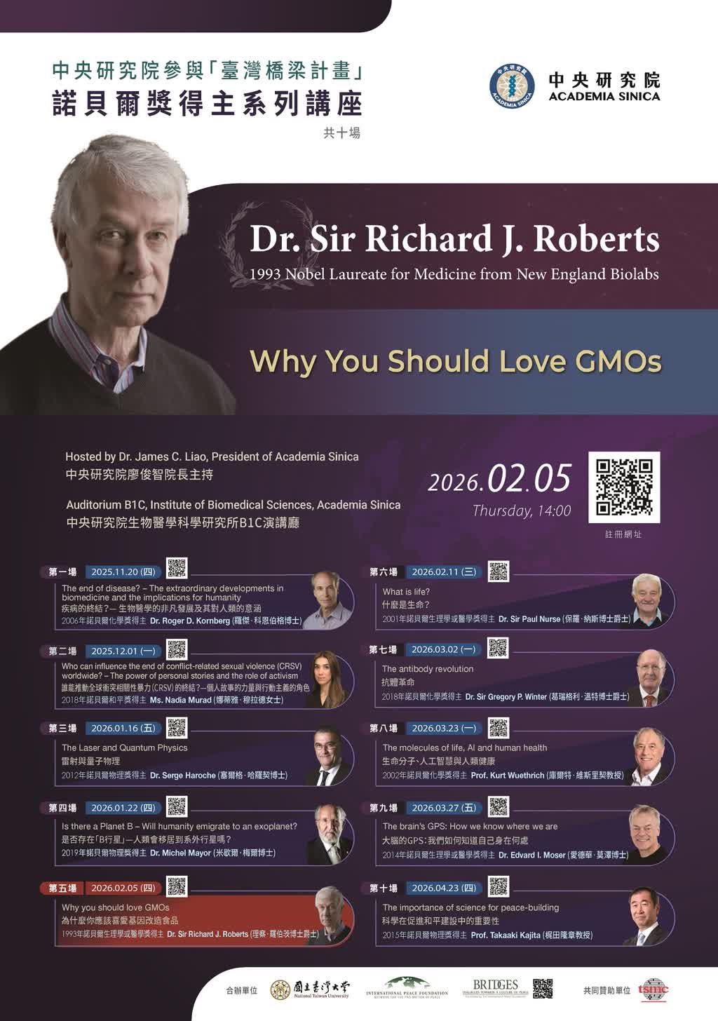 | 主 旨 【代公告】 中央研究院參與「臺灣橋梁計畫」(TAIWAN BRIDGES)邀請諾貝爾獎得主理察.羅伯茨(Richard J. Roberts)博士爵士蒞院發表專題演講 | |||